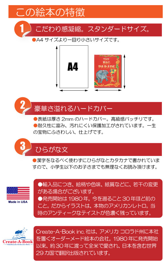 ○オリジナル絵本「ビッグパレード」は、あなたのお子さんが主人公で登場する世界に一冊だけの名入れ絵本。
