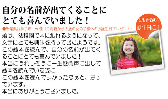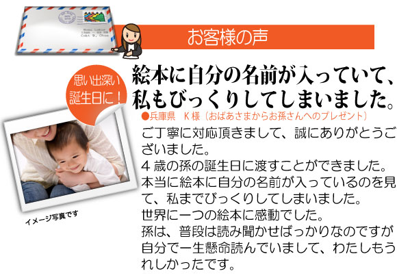 お子様は、絵本の中に自分の名前が出てくることに大喜びするんです。