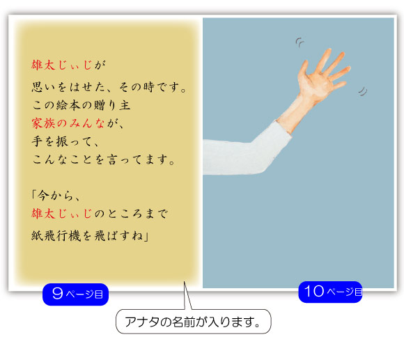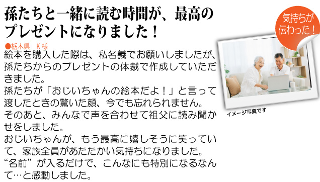 絵本を購入した際は、私名義でお願いしましたが、孫たちからのプレゼントの体裁で作成していただきました。