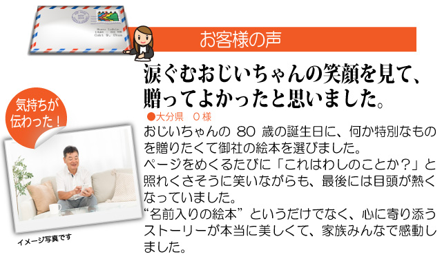 おじいちゃんの80歳の誕生日に、何か特別なものを贈りたくて御社の絵本を選びました。