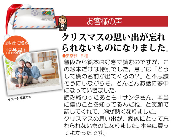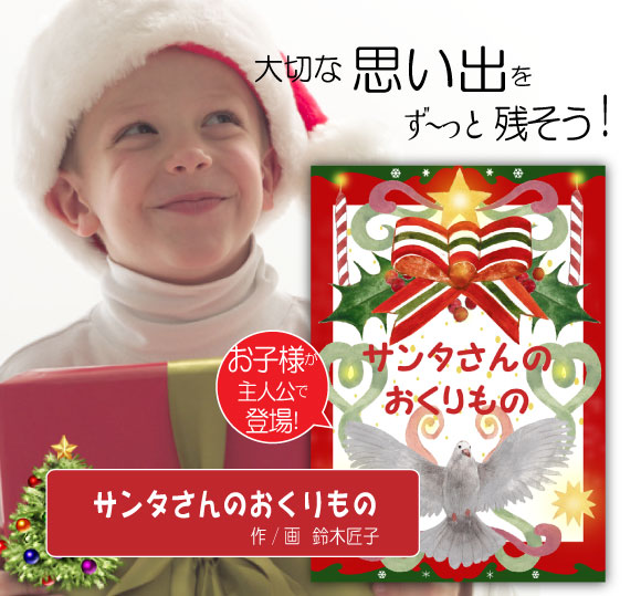 ■オリジナル絵本「サンタさんのおくりもの」は、男のお子さんが主人公になる世界にひとつの名入れ絵本。絵本の各ページにお子様のお名前が印刷されます。