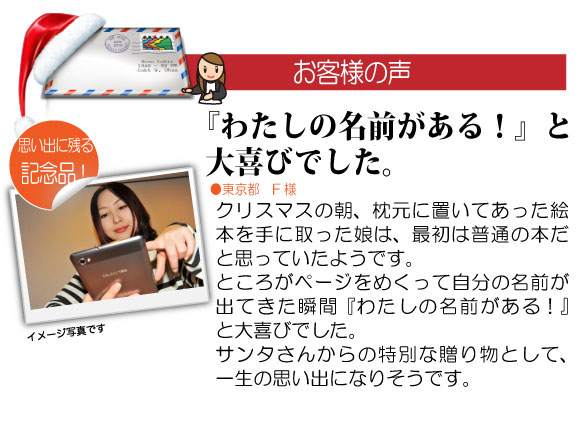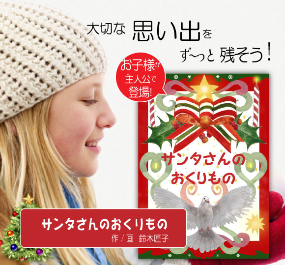 ■オリジナル絵本「サンタさんのおくりもの」は、小学生くらいの女のお子さんが主人公になる世界にひとつの名入れ絵本。絵本の各ページにお子様のお名前が印刷されます。